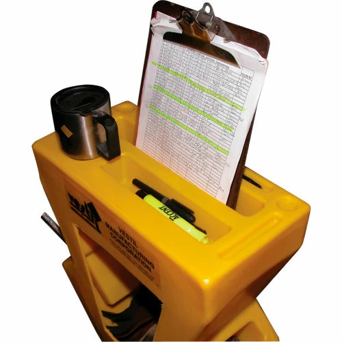 If you’ve ever tried to maneuver a pallet truck and carry all of the accessories required to do your job, then you’ll find this product essential for every pallet jack you own. Caddy features a cup holder, pen/pencil tray and clipboard holder on the top, twin tool pockets on the sides, and a large storage compartment in the back that can also be used as a wastebasket. Storage caddy is manufactured of durable molded plastic and can be easily attached to virtually any pallet truck using the included hardware and installation instructions. US Patent #7,810,821.
